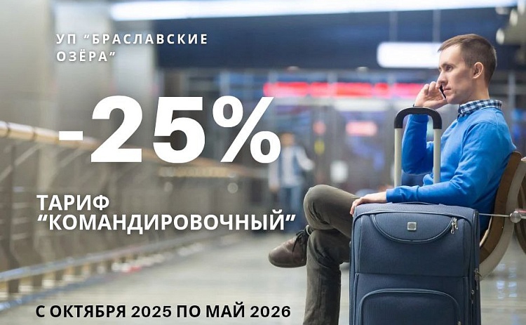С 1 октября 2025 года по 31 мая 2026 года мы рады предложить вам специальный тариф «Командировочный» со скидкой 25%! Это отличный вариант для всех, кто приезжает в Браслав по рабочим вопросам.