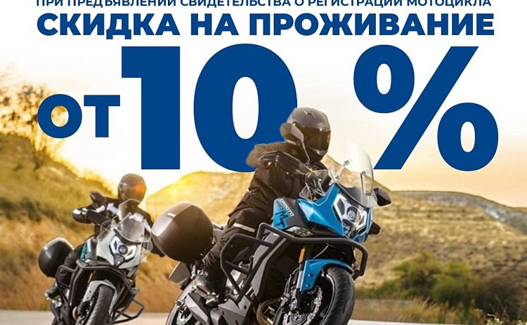 Скидка от 10% на проживание при предъявлении свидетельства о регистрации мотоцикла.